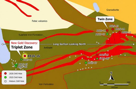 • Drill hole AR26-16 returned two gold zones from a broad 35.45m interval of sulphide-bearing iron formation and altered dacite, grading: