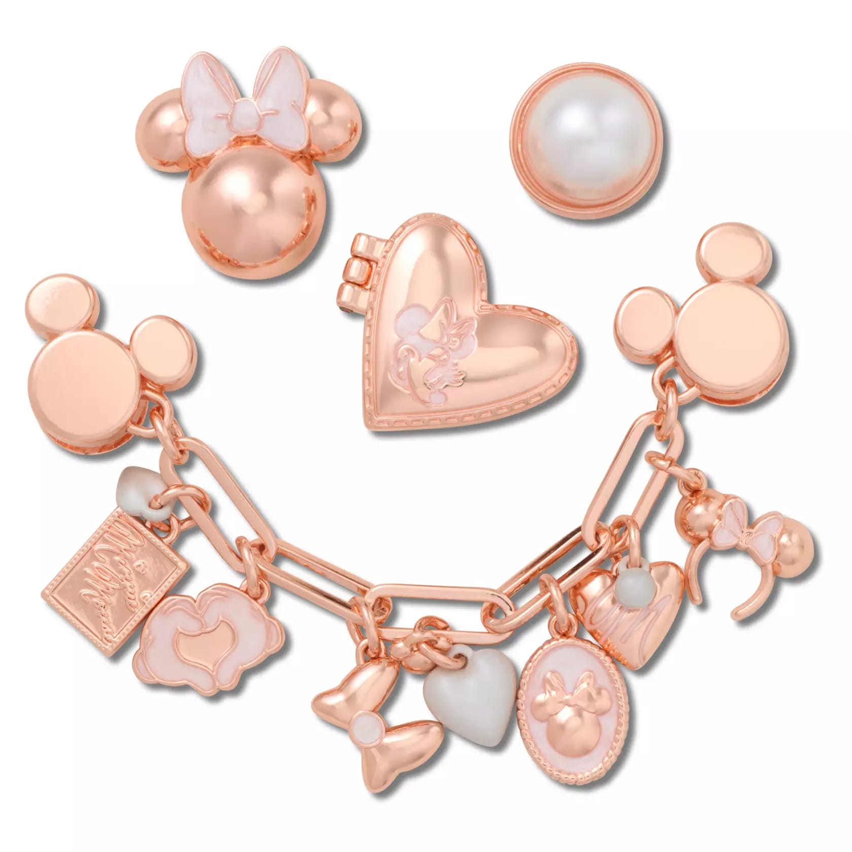 The three individual charms include a pearl, a Minnie head, and a heart-shaped Minnie locket. Attached to the charm chain are seven different charms: a Minnie autograph card with a tiny white heart, Mickey’s hands forming a heart shape, Minnie’s bow, a larger white heart, a Minnie cameo, a metallic heart with a pearl bead, and a Minnie ear headband.