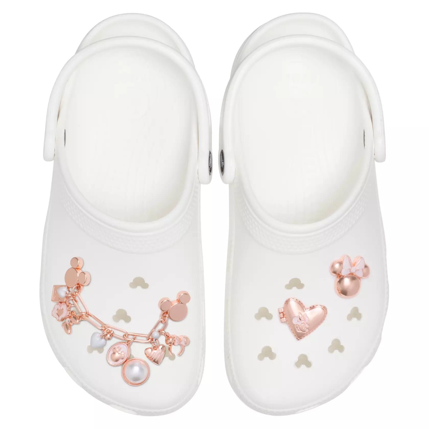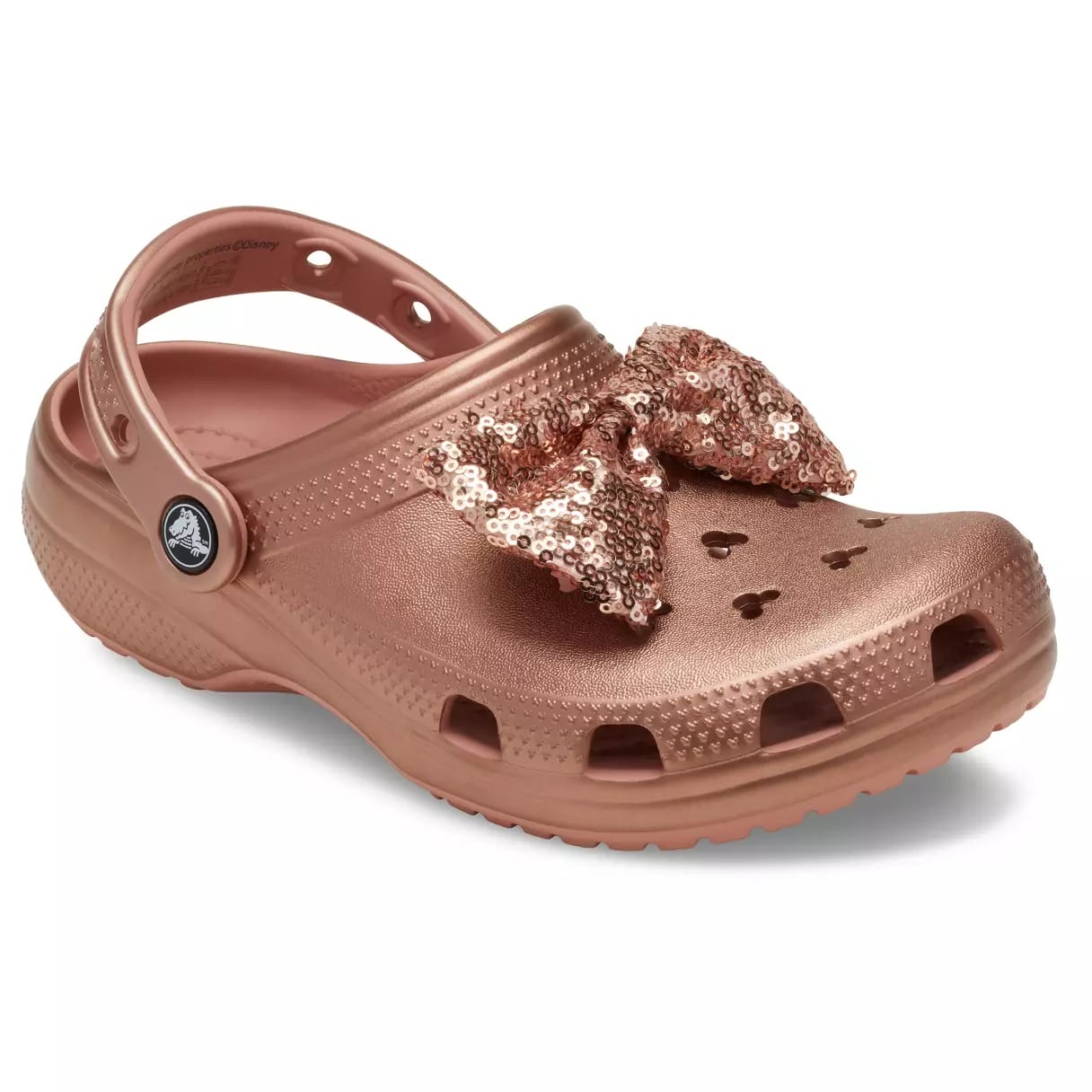 Made of Crocs’ signature Croslite foam, the shoes have a metallic rose gold finish. They’re adorned with rose gold sequin bows. The ventilation holes on top are Mickey-shaped.