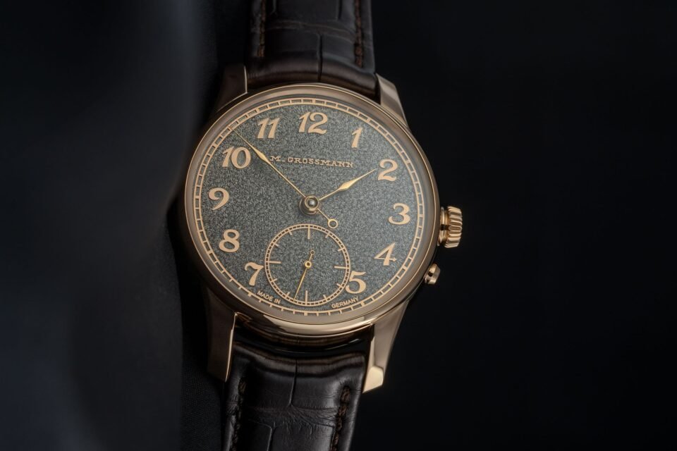 As before, the numerals, logo and tracks are not applied but carved in relief, then polished by hand to contrast with the matte, grained background. Two executions are offered. The rose gold case version features a black rhodium-plated dial, creating a strong contrast with the polished elements and matching gold hands. The platinum version retains the natural tone of the gold dial, paired with polished steel hands. Both retain the historic “M. Grossmann” logo as used in 1875.