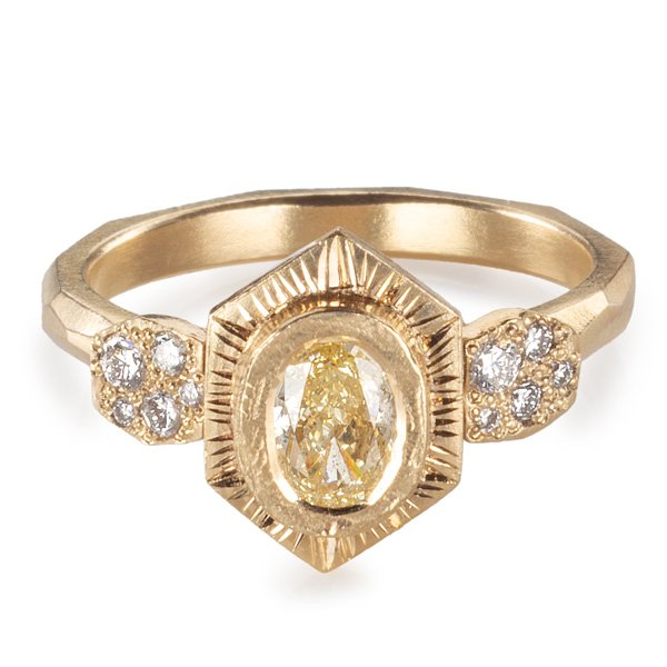 Top: Hexa faceted ring in 9k yellow gold with 0.51 ct. lab-grown fancy yellow diamond and white lab-grown diamonds, £2,990 ($4.050); Maria Manola
