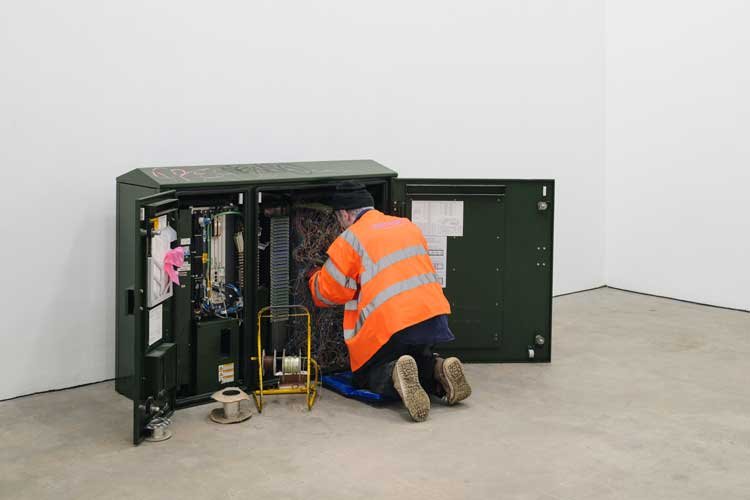 The broadband is on the blink at the Ikon Gallery – or so it appears. A graffiti-covered telecoms cabinet, teeming with spaghetti-like wires and attended to by a waxwork Openreach engineer, stands at the entrance of Dion Kitson’s exhibition Rue Britannia. It sets the scene for a selection of incisive, witty and, at times, bleak sculptures in which the Black Country artist muses on aspects of class, identity and the ruination of everyday life in modern Britain. Titled Ill Communication (2024), the show’s opener perhaps alludes to a breakdown in public discourse and civil debate. Conversely, it could refer to the role of overlooked workers in keeping us all connected. Further still, the work’s title, borrowed from the Beastie Boy’s acclaimed 1994 album, may be a tongue-in-cheek boast regarding the cogency, or otherwise, of Kitson’s art. Such ambiguity abounds throughout the exhibition.