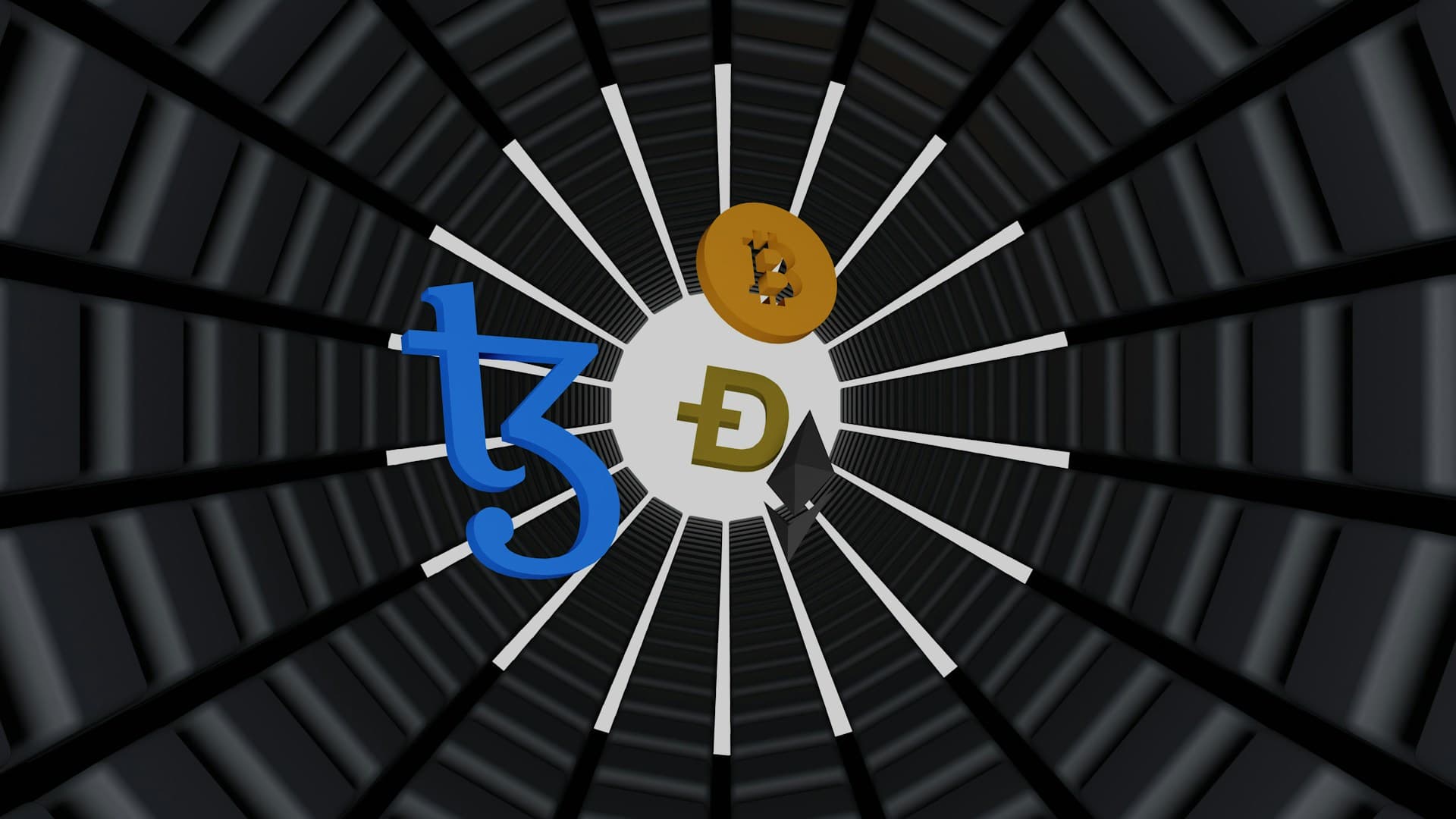 3D illustration of Tezos coin, bitcoin, Ehtereum and dogecoin.