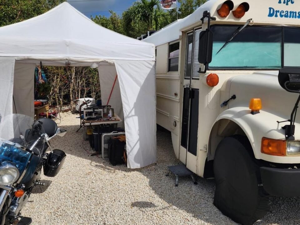 Schaub, a certified diesel technician and GM electrical specialist, drove his skoolie down to the Keys with his wife and settled on Sugarloaf early on.